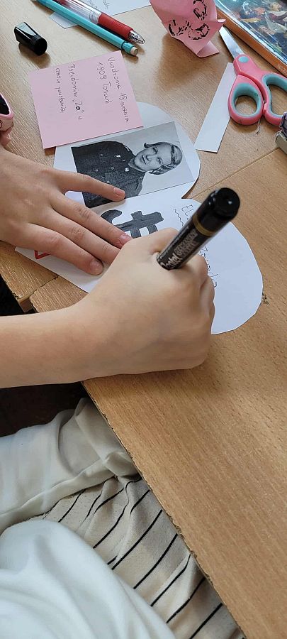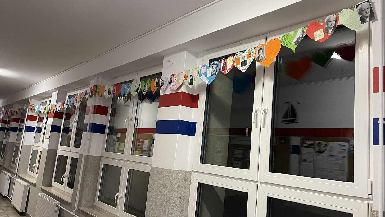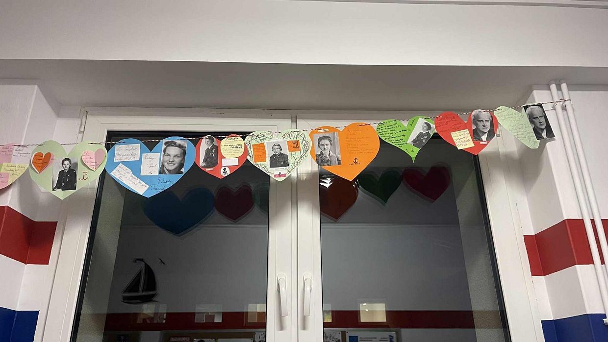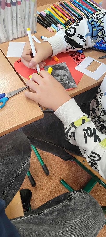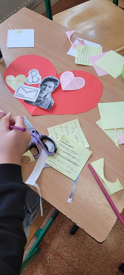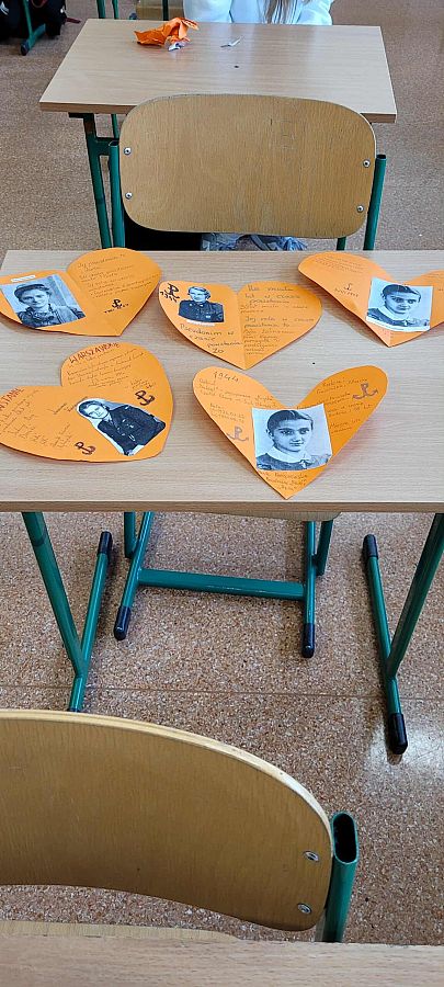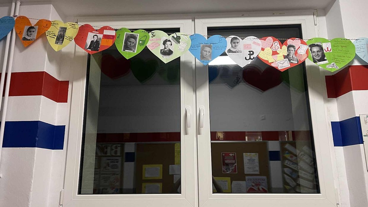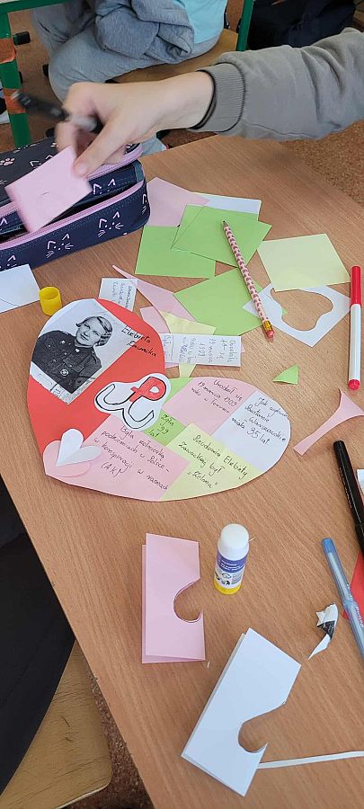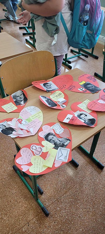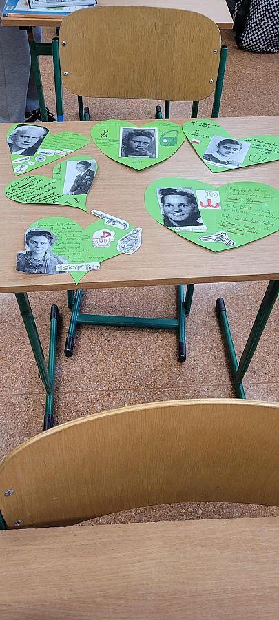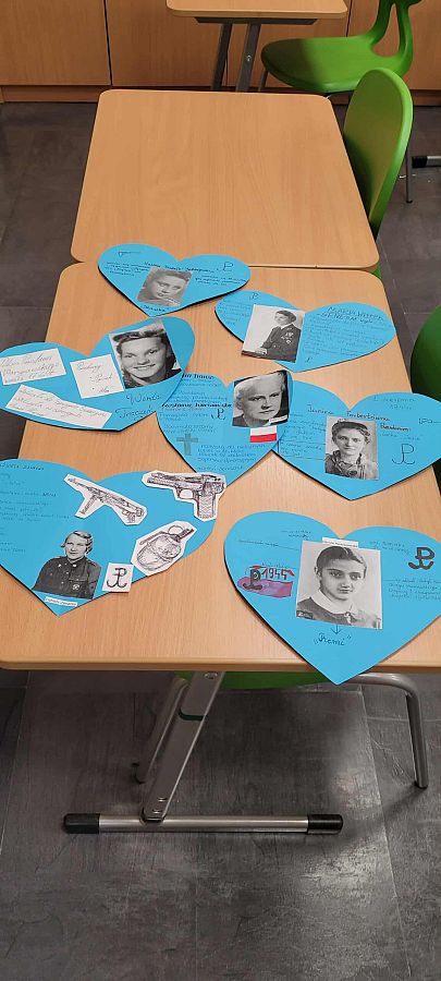 Pracując w grupach, każdy uczeń przygotował własną zawieszkę - serduszko, na której umieścił imię i nazwisko, pseudonim oraz informację o roli wybranej uczestniczki powstania. To zadanie zwróciło uwagę na konkretne wyzwania, jakie podejmowały kobiety w Powstaniu Warszawskim. Z zawieszek – serc powstała girlanda, która została zawieszona na szkolnym korytarzu.