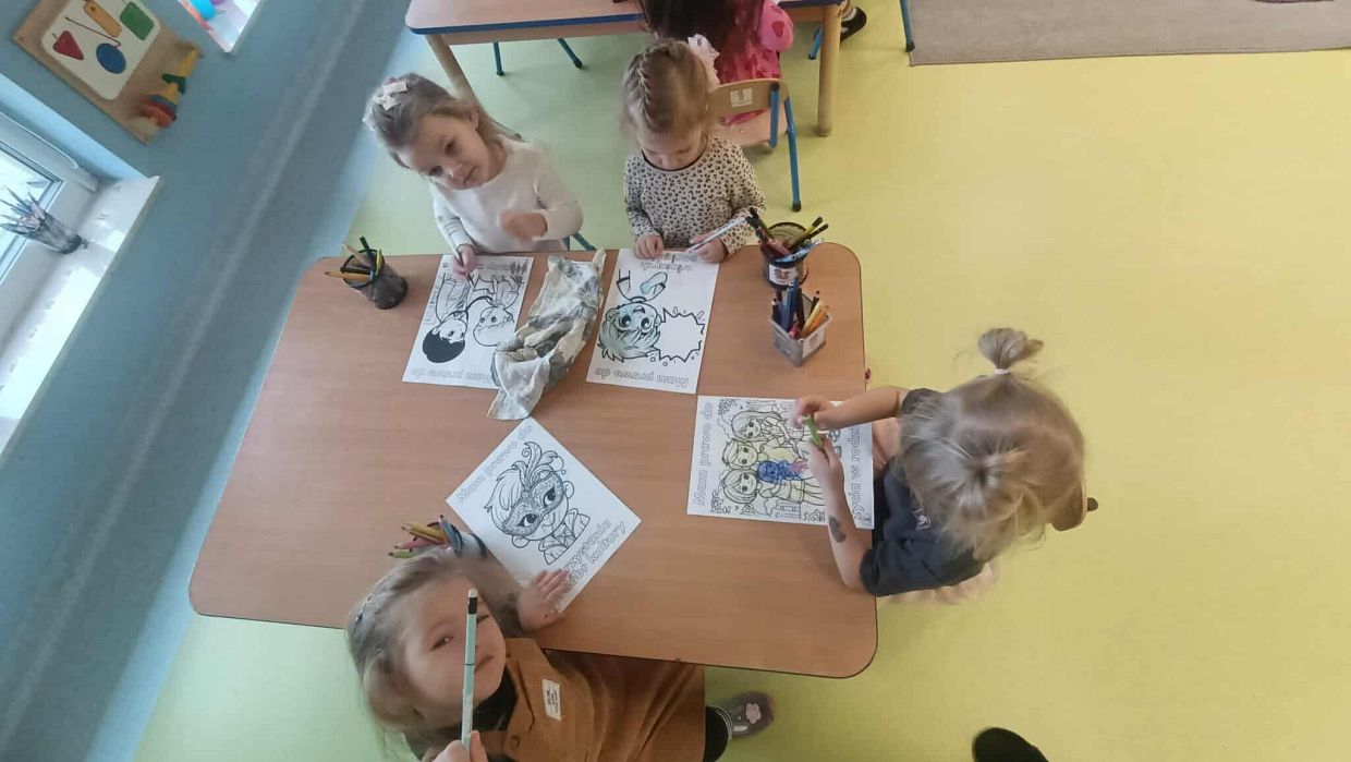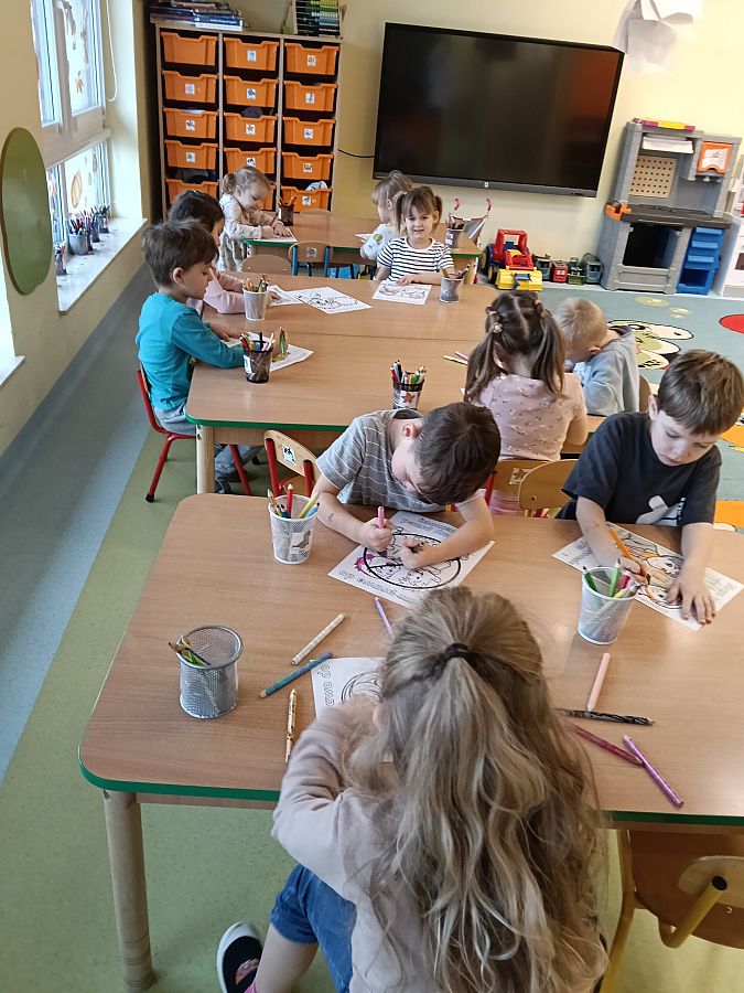 Podczas zajęć kolorowaliśmy ilustracje przedstawiające wybrane prawa dziecka, co pozwoliło nam jeszcze lepiej je zapamiętać i zrozumieć. Dzieci z zaangażowaniem tworzyły barwne prace, a atmosfera była pełna ciekawości, uważności i radości.