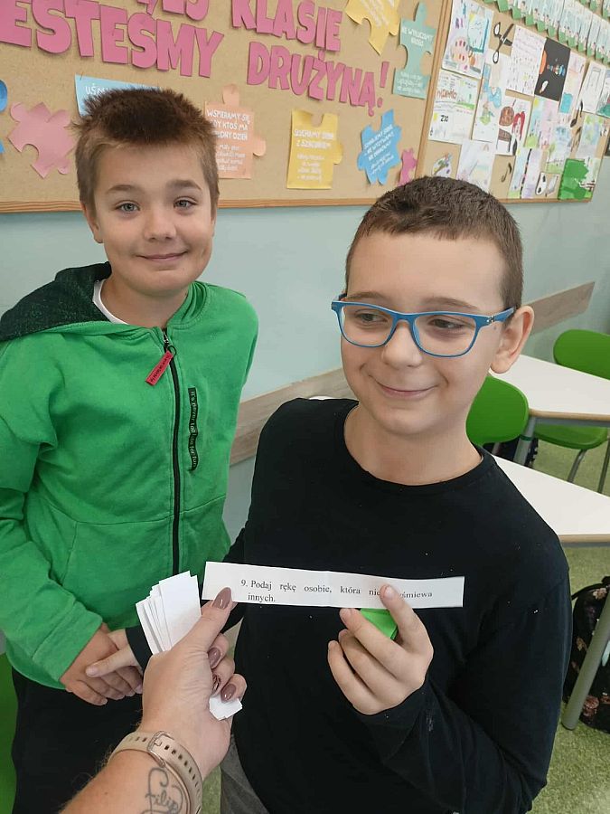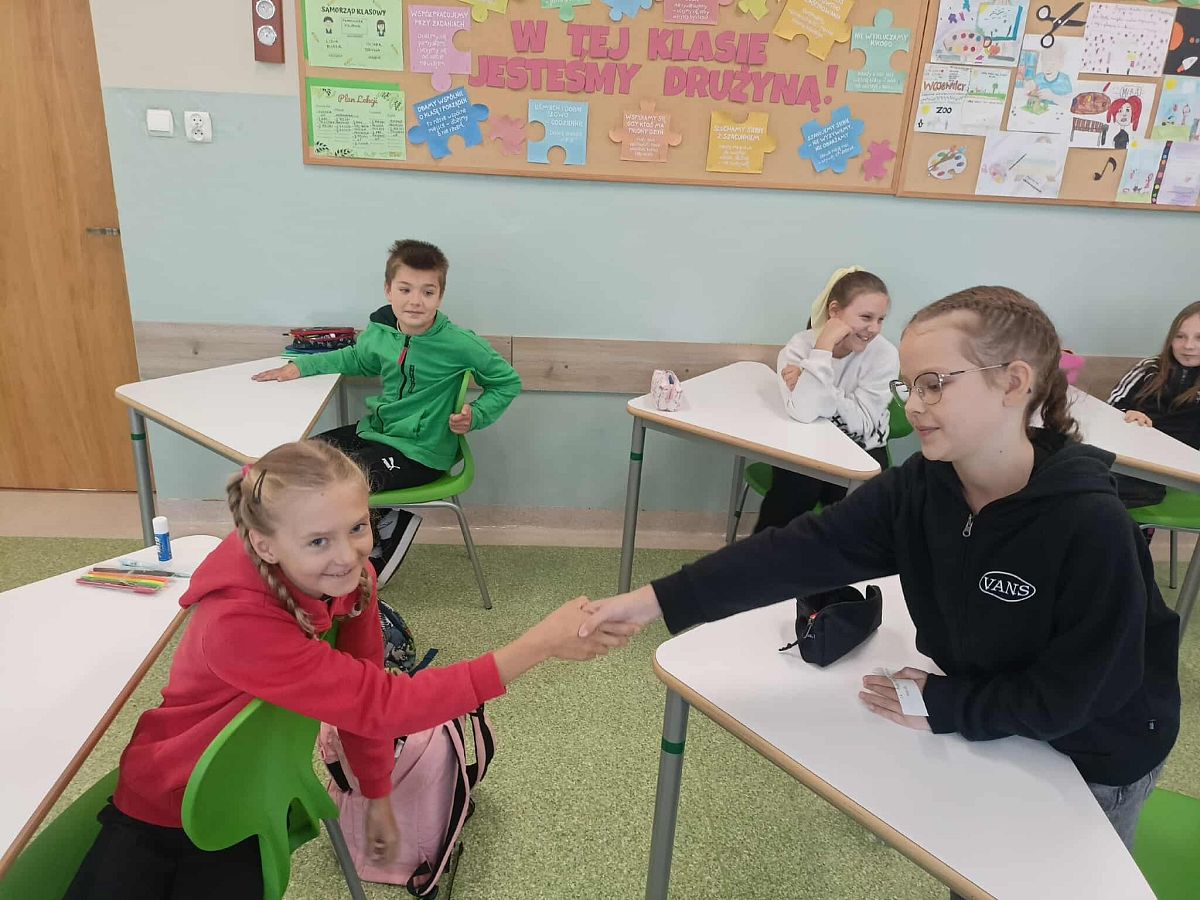 Dla uczniów klas 4–8 przygotowano wyzwanie klasowe zatytułowane „Podaj rękę”. Polegało ono na losowym dobraniu zadania, polegającego na okazaniu wsparcia poprzez podanie ręki osobie, która spełnia określone kryteria, np. „Podaj rękę osobie, która nigdy Cię nie wyśmiała” Celem tego działania była integracja zespołów klasowych oraz budowanie relacji interpersonalnych. Poniżej kilka ujęć z realizacji tych działań.