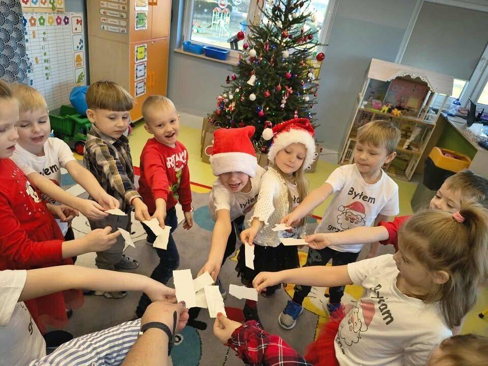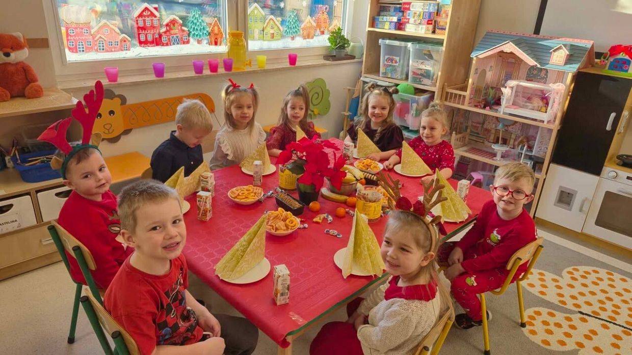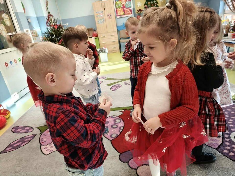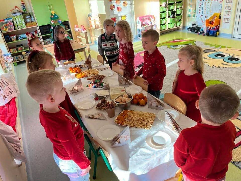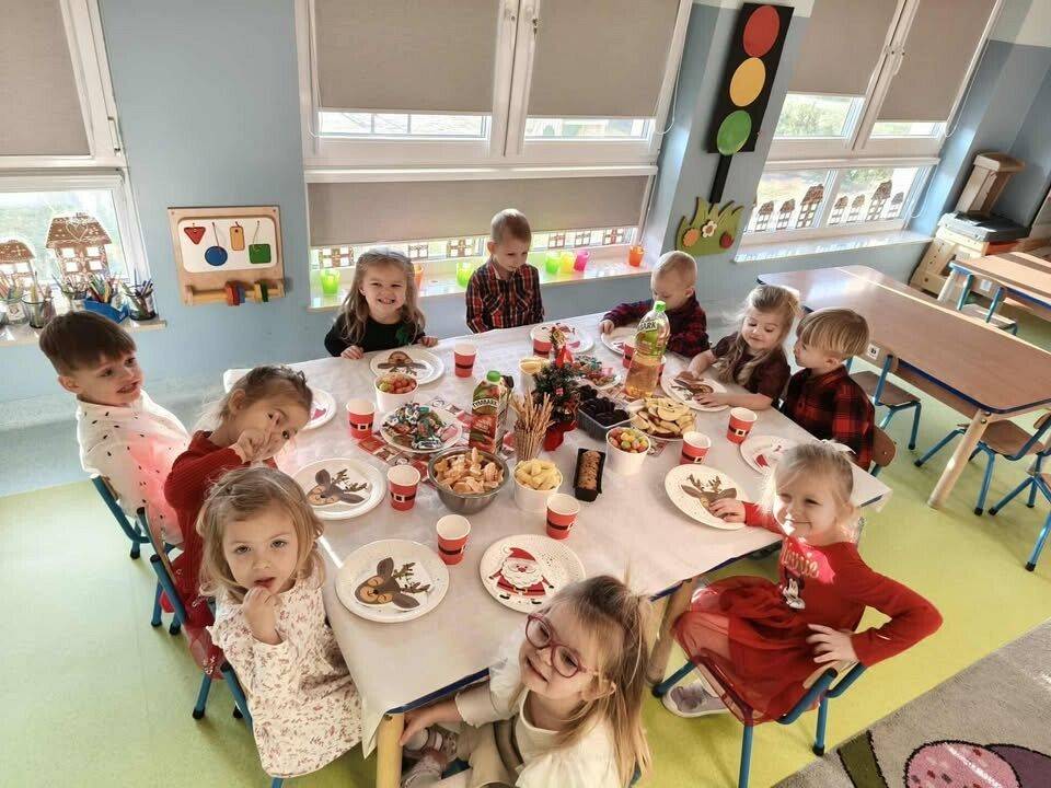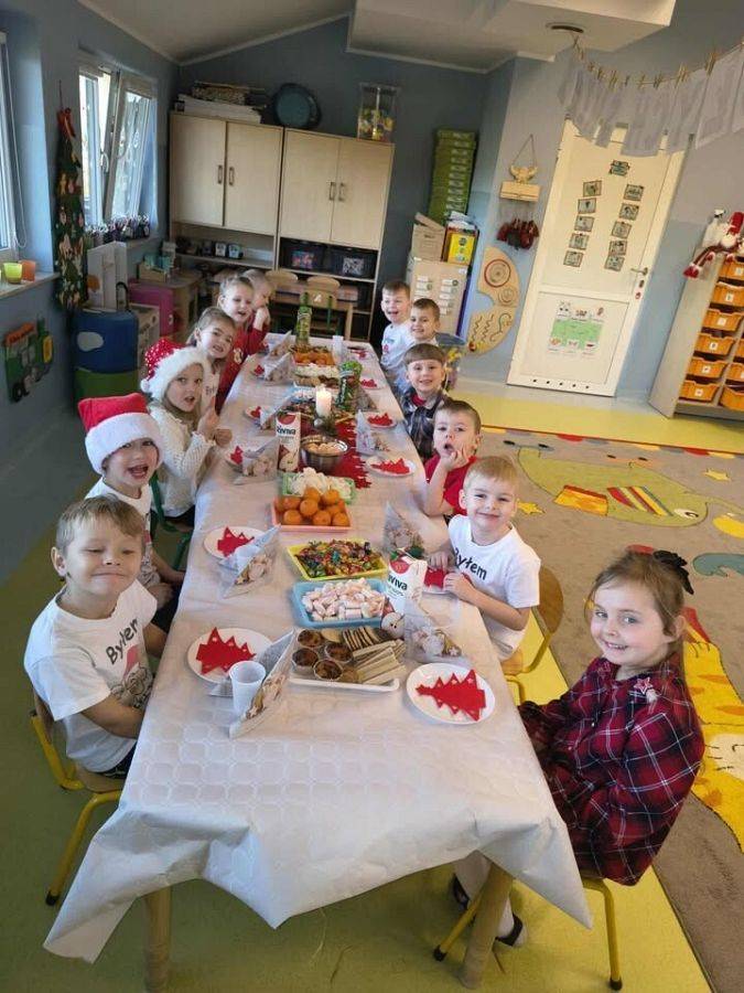 W naszym przedszkolu panowała wyjątkowa, świąteczna atmosfera. Dzieci uroczyście obchodziły Przedszkolną Wigilię, podczas której wspólnie śpiewały kolędy i pastorałki, dzieliły się opłatkiem oraz składały sobie serdeczne życzenia. Spotkanie przebiegało w klimacie radości, ciepła i wzajemnej życzliwości. Wigilijne obchody były dla dzieci pięknym przeżyciem, pełnym uśmiechów i pozytywnych emocji, a także okazją do poznania i pielęgnowania bożonarodzeniowych tradycji.