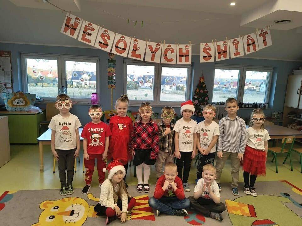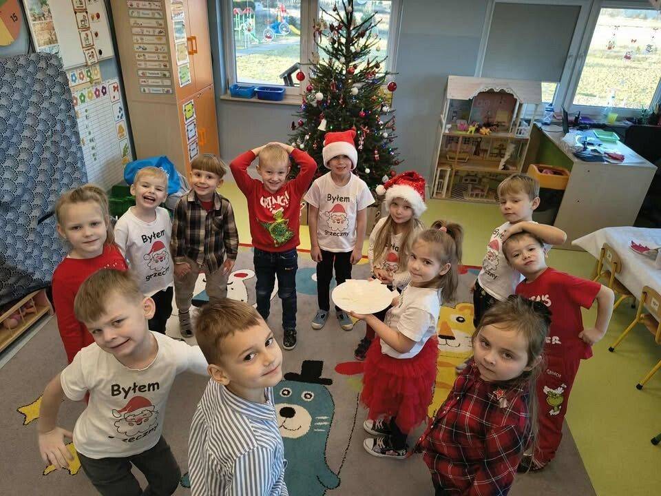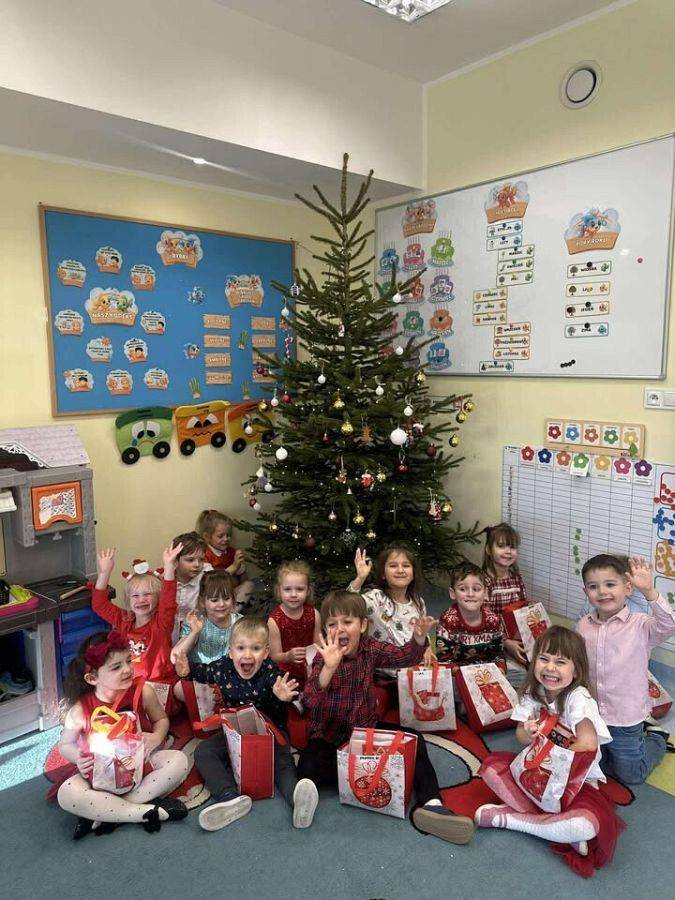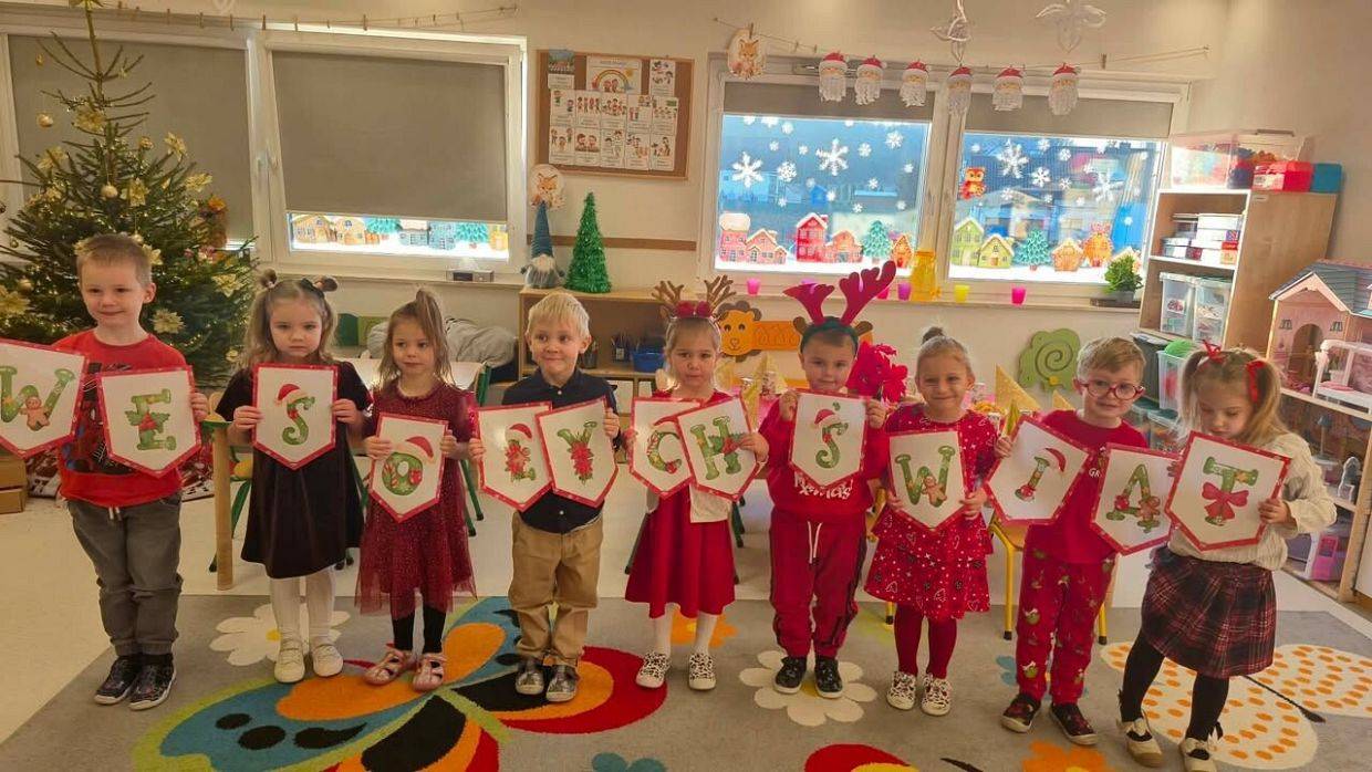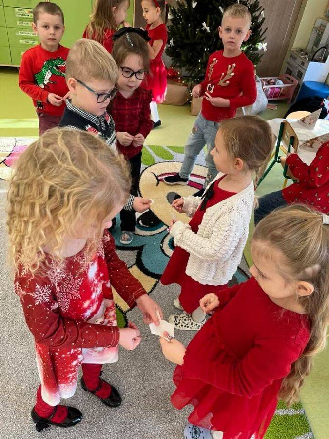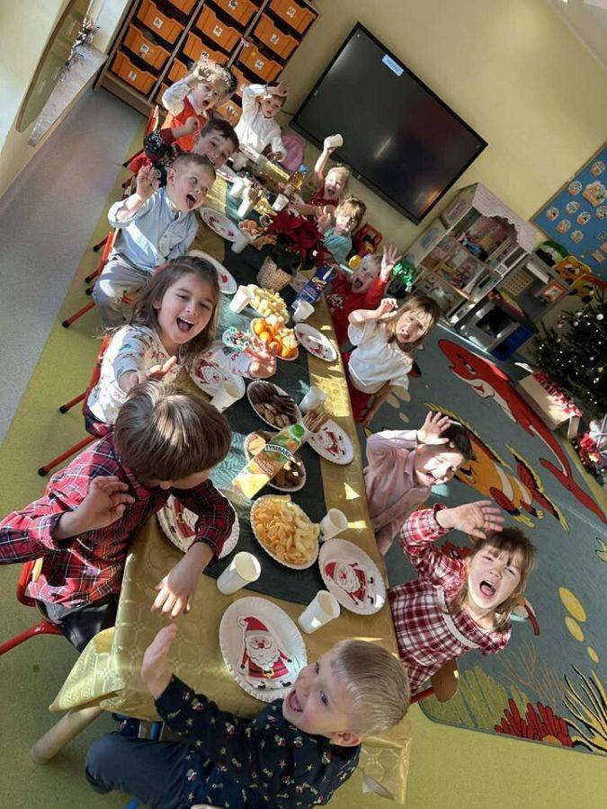 W naszym przedszkolu panowała wyjątkowa, świąteczna atmosfera. Dzieci uroczyście obchodziły Przedszkolną Wigilię, podczas której wspólnie śpiewały kolędy i pastorałki, dzieliły się opłatkiem oraz składały sobie serdeczne życzenia. Spotkanie przebiegało w klimacie radości, ciepła i wzajemnej życzliwości. Wigilijne obchody były dla dzieci pięknym przeżyciem, pełnym uśmiechów i pozytywnych emocji, a także okazją do poznania i pielęgnowania bożonarodzeniowych tradycji.