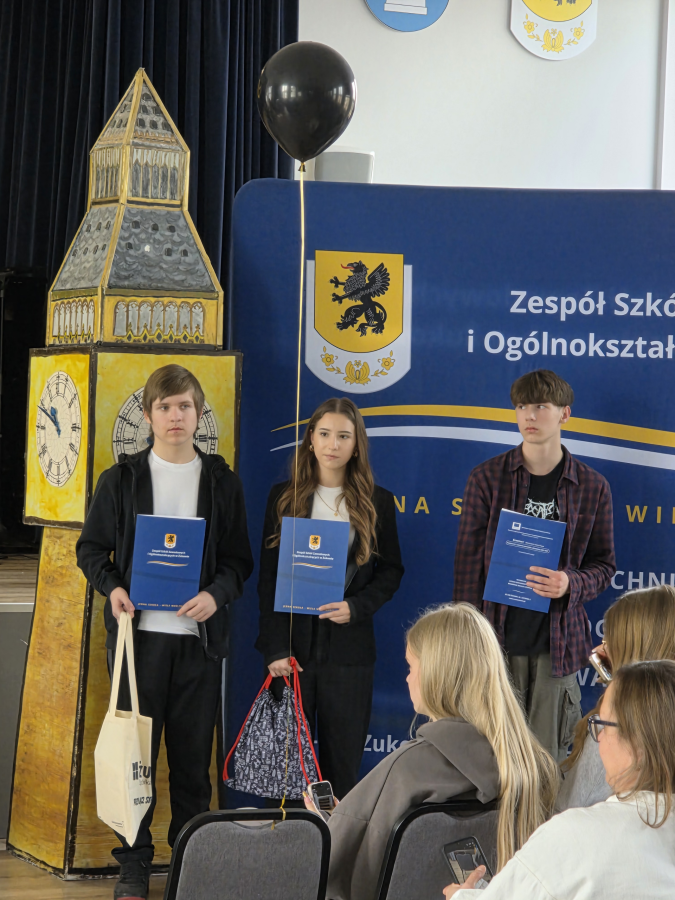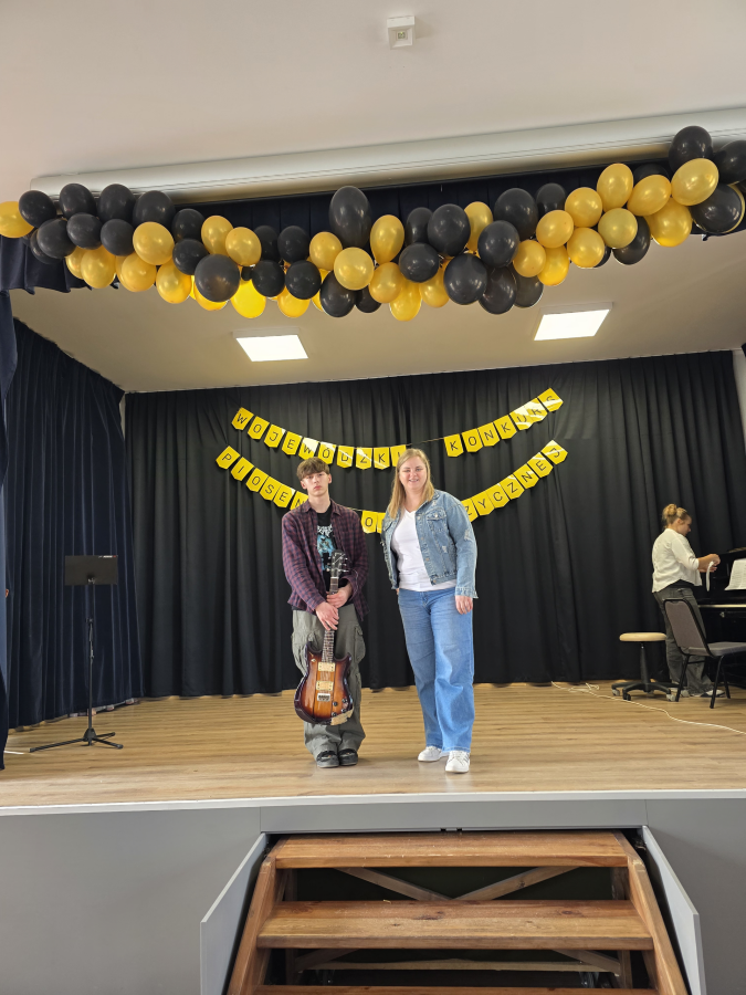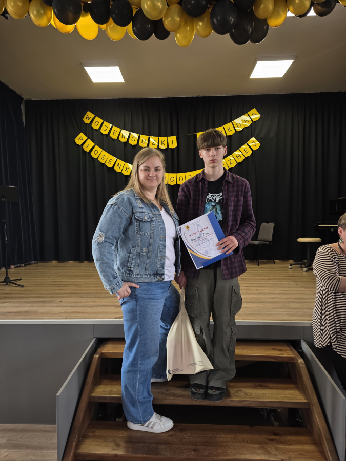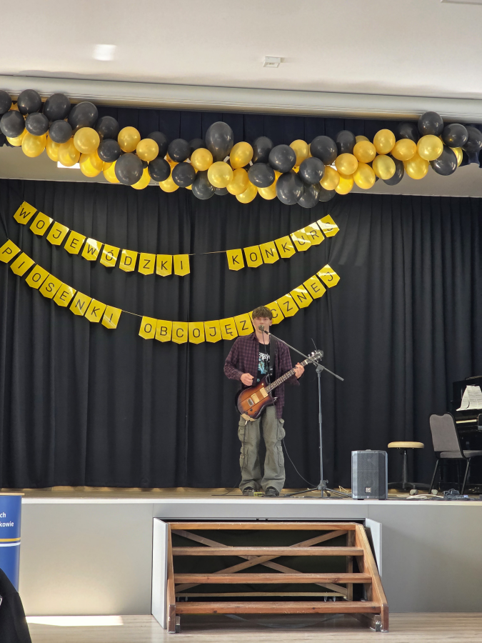 Wielki sukces Wojtka Pionki z klasy 8a. Wyśpiewał on, grając również na gitarze wyróżnienie w II Wojewódzkim Konkursie Piosenki Obcojęzycznej w Żukowie. Był to jego debiut na scenie konkursowej. Wojtek w swojej kategorii pokonał 25 osób. Wielkie brawa!